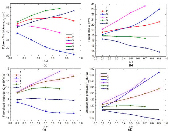 The lubrication performance of the six pads is shown in Figure 10. It can be seen that the cylindrical pad, saddle pad, and reverse transverse pad could increase the fulcrum film thickness, and the saddle pad had the most significant effect on the increase in the film thickness. The fulcrum film thickness of the transverse pad was obviously reduced, and the load-carrying capacity was weakened. Although the spherical pad was beneficial to increasing the fulcrum film thickness when Δc was small, with the increase in Δc, the fulcrum film thickness decreased to even lower than that of the plane pad. Compared with the other pads, the power loss and maximum film pressure of the spherical pad would be the largest. The power loss and maximum film pressure of the saddle pad were close to those of the plane pad, but the flow increased significantly. The cylindrical pad was found to be mediocre.