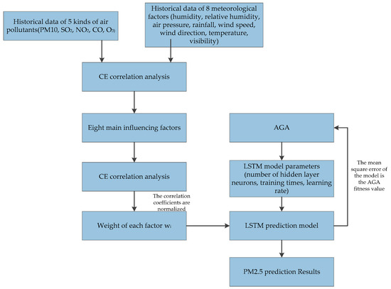 This paper proposes a prediction model for the PM2.5 concentration: the CE-AGA-LSTM model. Taking the meteorological data and air pollutant data of Beijing in 2016 as an example, the CE-AGA-LSTM prediction model and eight other models were compared based on the MAE, RMSE and R2 indexes. The CE-AGA-LSTM prediction model used five randomly selected time series data samples as input data to predict PM2.5 concentration. Its average results in terms of MAE, RMSE and R2 were 14.49826, 21.88822 and 0.9508, respectively. Compared with the results of other models, the results showed that the CE-AGA-LSTM prediction model is feasible. The prediction accuracy of the model on the test set reached 92.8%.