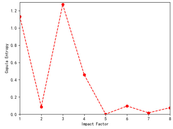 The mutual information (MI) indicator that describes the interrelation between different variables originates from the information theory and reflects the size of common information regarding different variables, i.e., the larger MI is, the stronger the correlation between the variables, and vice versa, the weaker the correlation. Assuming that there is a certain connection between the random variables and , the MI between them can be calculated by Equation (1)