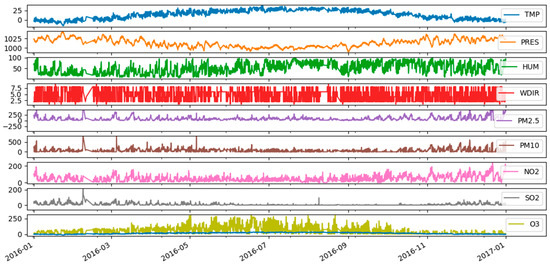 Based on Section 4.2.1, eight impact factors were selected using the CE method, and the new obtained dataset had 10 dimensions, i.e., PM10, NO2, SO2, O3, PRES, TMP, HUM, WDIR, PM2.5; so, the dataset contained a total of 64,300 data records. The pattern of change of each feature at different times was further analyzed by plotting the time-series feature maps of each feature at different times, as shown in Figure 4. From Figure 4, it can be seen that each feature of the dataset had a certain periodicity.