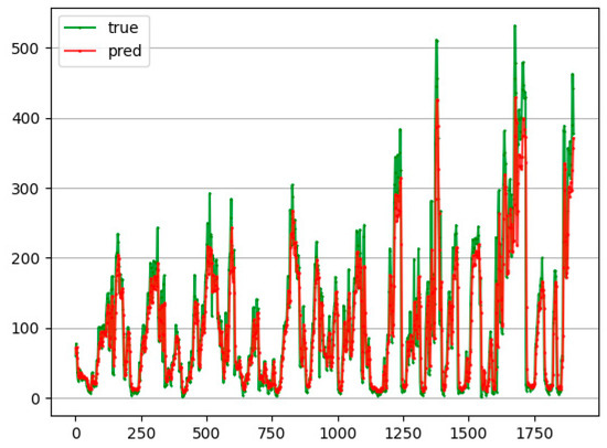 The loss rate and PM2.5 concentration prediction results of the method in this paper for the test set are shown in Figure 5 and Figure 6. As can be seen in Figure 6, the prediction accuracy of the CE-AgA-LSTM prediction model reached 92.8%.