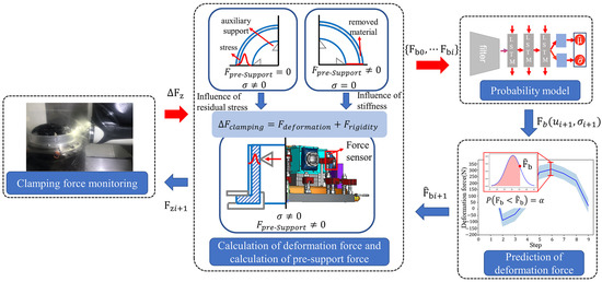 We solve the above three problems through the following work. First, a set of sophisticated clamping devices with force sensors are developed. Second, we establish the conditions of auxiliary support failure and a method for calculating the deformation force based on the concept of equivalent flexibility. Third, we propose a probabilistic model to predict the deformation force of the future subsequent machining step by the use of deep autoregressive network and Kalman filtering. The probabilistic model predicts the subsequent deformation force based on the preceding deformation force, which can lower the risk of auxiliary support failure, while the Kalman filtering helps reduce the modeling and measurement errors. Ultimately, the support force is determined by the probabilistic model of deformation force prediction and the equivalent flexibility, whose use prevents the auxiliary support from failing (i.e., to guarantee the required deformation force).