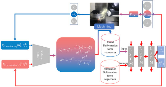 In machine learning, it is usually assumed that, while the training data and the test data are independent of each other, they are identically distributed. However, the training data are derived from simulation while the model needs to be applied to real world data. We consider the difference between the simulated data and the real world data as a modeling error. Kalman filtering is an algorithm that uses the system state equation to optimally estimate the state of the system by using the system observations, and it can reduce the measurement noise to restore the true measurement value. The deformation force measurements and the deformation force prediction values are the input to the Kalman filter algorithm. The optimal estimate of the deformation force is calculated according to Equation (21), which is then input to the deep autoregressive neural network to predict the deformation force of the next machining step.