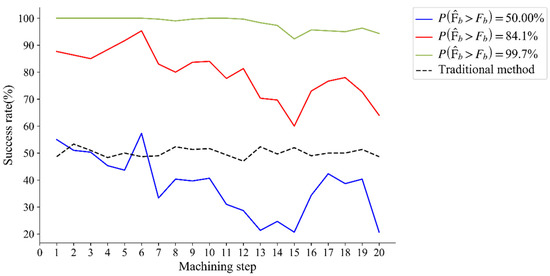 The deformation force verification data are generated the same way as the training data. For the verification data set, if , the clamping force can be monitored. The prediction probability model of deformation force is compared with the traditional approach of using the mean value of deformation force in the training set as the basis of applying the pre-support force. The monitoring success rate of clamping force in each machining step is shown in Figure 6. If the support force is applied according to the average value of the deformation force, the clamping force monitoring is effective at around 50%. If pre-support is applied only according to the end-to-end model (), the results may be too poor at certain machining steps. The simulation results show that the application of pre-support forces according to a probabilistic model can effectively improve the success rate of clamping force monitoring.