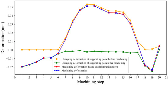 When simulating the process of releasing the deformation of a part, we retain the constraints at the force exertion and clamping points, remove the constraints at the auxiliary supports, and calculate the deformation at each machining step based on the displacements at the support points. Figure 10 shows the variation of clamping deformation before and after the machining with the supporting forces and the discrepancy between the real (i.e., measured) and the estimated machining deformations. The clamping deformation before machining is less than 0.06 mm and the final effect of clamping deformation is less than 0.003 mm. In principle, an exerted pre-deformation force could compensate the part deformation, i.e., pre-deformation force can help reduce the final part deformation.