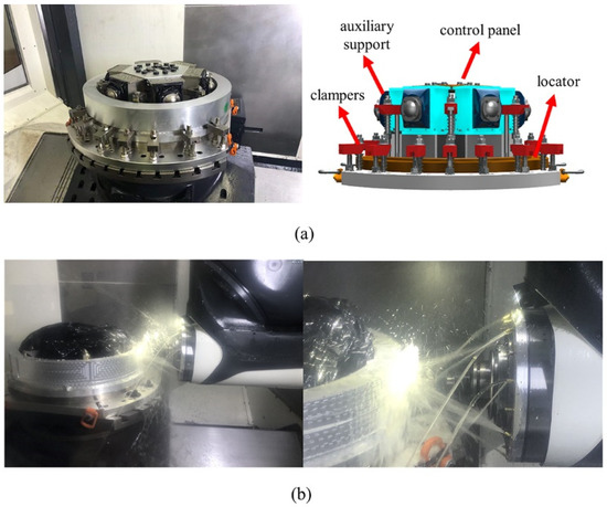 The proposed method is also verified by physically machining an aluminum alloy aero-engine casing part on a DMG 80P machine tool. In the experiment, the machining parameters are set as follows: spindle speed 6000 rpm, cutting depth 1.25 mm, cutting width 8 mm, feed rate 1000 mm/min, and tool diameter 20 mm. In order to monitor the radial deformation force of the part, a fixture with both clamping force control and monitoring function is designed and fabricated as shown in Figure 11a. The fixture consists of a flat positioning element, a plurality of axial clamping element, and the auxiliary supports arranged along the circumference.