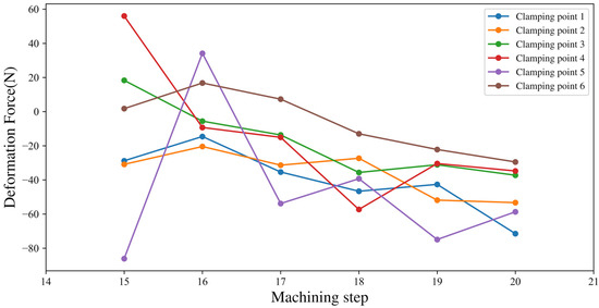The part is machined while the change in clamping force being monitored and recorded, as shown in Figure 11b. The pre-support force is exerted according to the proposed model, and the deformation forces are monitored/recorded at certain machining steps of the in-process workpiece, based on which the corresponding part deformation is calculated. Figure 12 shows the deformation forces monitored in the experiment. It is necessary to mention that, if the thickness of the part is too large, it will be inaccurate to calculate the deformation of the measurement points which will be outside the part based on the calculated deformation forces at the clamping points. The amounts (in mm) of deformation respectively obtained by our estimation model and physical measurement are both listed in Table 2, which show an error range of 0.001–0.008 mm.