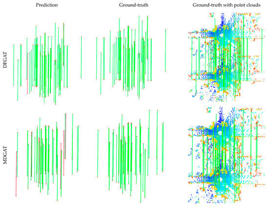 Figure 3. Visualization of matching results on KITTI. The first column are keypoints detected and matched using our method and MDGAT. The second column are ground-truth results without raw point clouds while the third column represents ground-truth results including raw point clouds. Our method performs better in terms of keypoints matching with more correct pairs (green) and fewer wrong pairs (red).
