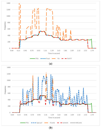 In addition, to compare the accuracy of the algorithms in conditions where the pitch contours included no or only a few errors, an offline pitch-detector algorithm provided in the Praat tool [28] based on the Boersma algorithm [29] was used. According to Faghih and Timoney’s studies [4,5], the Praat and Pyin accuracies tend to be similar.