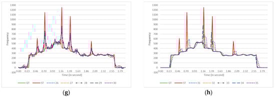 The effect of each contour-smoother algorithm on a pitch contour from a female singer producing arpeggios in the C major scale. The pitch estimator algorithm was FComb. GT = Ground Truth (PYin), ST = Estimated pitch contour. For more straightforward observation, the smoothed contours are plotted in parts (a–h). Each panel (a–f) plots three smoothed contours, while panels (g,h) have four contours each. Descriptions of the algorithms’ codes are provided in Table 1.