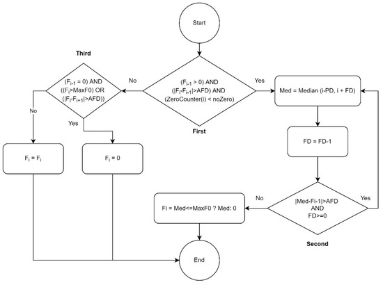 where is the original signal at position , and is the smoothed signal at position . In addition, indicates the variance of the Gaussian filter. The smoothing degree depends on the variance value size [9]. Although the Gaussian filter smooths out the noise, as shown in Figure 2a, some correctly estimated F0 may also change, i.e., become distorted [9].