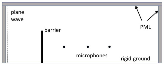In order to avoid unwanted numerical reflections in the considered rectangular numerical calculation domain, a Perfectly Matched Layer (PML) [18] is located at three of the four numerical domain boundaries, depicted in Figure 2. Bear in mind that the sound can be reflected on the ground, corresponding to the lower horizontal boundary. Without loss of generality, in this work, a completely rigid floor will be considered, in other words, total reflection is assumed on the ground surface. With these boundary conditions, the numerical domain is excited by a plane wave travelling from left to right. The acoustic measurements have been numerically recorded at the microphones, located at the shadow area of a classical noise barrier. This FDTD model assumes that all the propagation domain is air, except the ground surface and the acoustic barrier that are completely stiff and reflective.