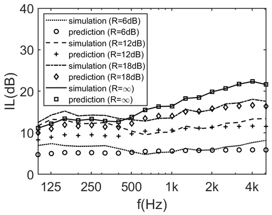 Values of IL index, predicted using the proposed simple model (Equation (5)) and simulated with the “modified FDTD” model, as a function of the frequency, for different values of noise reduction, R.