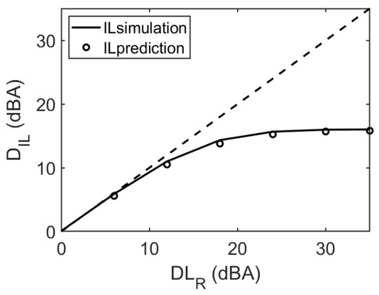 Relationship between global IL (DLIL) and DLR indexes. Black dashed line indicates the ideal behaviour of a noise barrier if diffraction at the upper edge is not considered (infinite height). Continuous line represents the variation of DLIL index as a function of DLR index obtained by the numerical FDTD simulation. Dots represent the global IL index obtained by the simple method proposed in this work (Equation (5)).