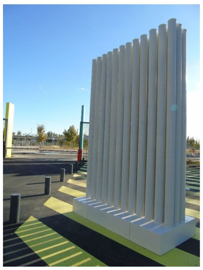 In the last few years, several authors have demonstrated the applicability of sonic crystals as noise barriers with the additional advantage of being almost transparent to wind and water [21]. Figure 6 illustrates a prototype of this kind of noise reduction devices. Sonic crystals are defined as heterogeneous materials formed by periodic arrangements of acoustic scatterers, commonly cylindrical elements, embedded in air and organized in a regular lattice distribution with a minimum distance between the centres of the scatterers, called lattice constant. These open acoustic screens present a new wave control mechanism due to the arrangement of the scatterers, which provides the appearance of bandgaps, defined as frequency ranges where the propagation of waves is forbidden or blocked. As a result, these structures can be effectively used as noise barriers providing significant attenuation in the bandgaps’ frequency range.