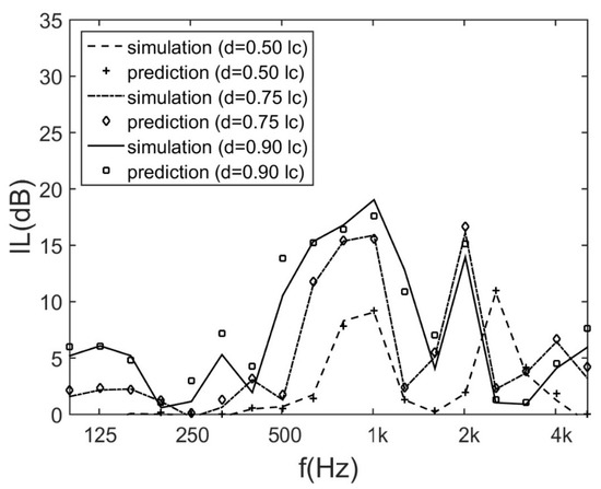 Values of IL index of sonic crystals noise barriers with different scatterer diameters. The lines correspond to 3D numerical simulations [22]. Lines with marks correspond to predictions using the model proposed in this paper (Equation (5)). Three values of the scatterers’ diameter (d) are plotted relative to the lattice constant (lc). (d = 50%, 70% and 90% of the lattice constant).