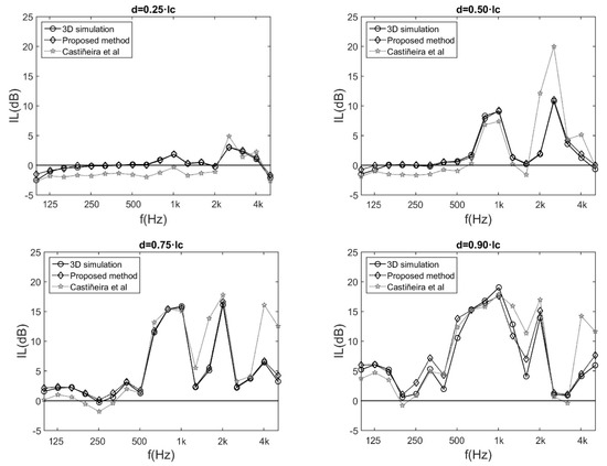 Comparison of the values of IL provided by the proposed method (Equation (5)) and the “overlapping method” proposed by Castiñeira et al. [23,24]. Different relations between the diameter of the scatterers and the lattice constant are illustrated. Top left, 25%; top right, 50%; bottom left, 75%; and bottom right, 90%. (Lines with circular markers: 3D numerical simulation; Lines with rhombus markers: proposed model (Equation (5)); Lines with star markers: “overlapping method” by Castiñeira et al. [23,24]).