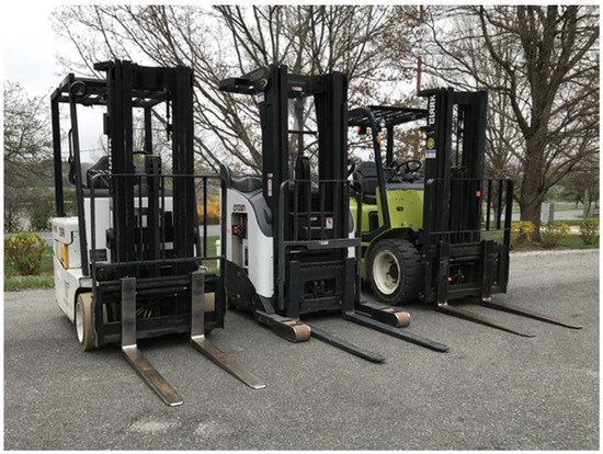 The forklift types utilized for this study included a Clark model CQ30L gas forklift, Clark model TMG15 electric forklift, and a Crown model RR 5715-35 reach truck (Figure 1). The specifications of the forklifts are listed in Table 1.