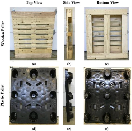 Representative picture of: (a): top; (b) side; and (c) bottom view of the wooden pallet; and (d) top; (e) side; and (f) bottom view of the plastic pallet.