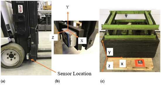 Representative picture of: (a): sensor location; (b) sensor orientation on the forklift; and (c) sensor location and orientation on the pallet.