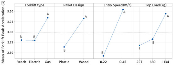 Main effects plot for forklift Peak Acceleration response. Tukey pairwise comparison indicates means that do not share a letter are significantly different at α = 0.05.