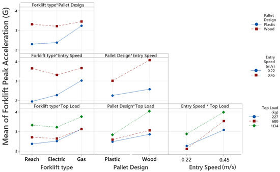 Figure 5 shows the interactions between the main effects. A change in pallet design affects the mean peak acceleration for the different types of forklifts. The change from a plastic to a wooden pallet design is associated with higher peak accelerations for the reach truck and the electric forklift.