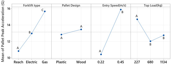 Main effects plot for pallet peak acceleration. Tukey pairwise comparison indicates means that do not share a letter are significantly different at α = 0.05.