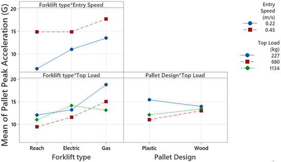 The p-values obtained in the analysis show that the main factors, including forklift type, entry speed, and top load, significantly affect the peak acceleration response measured on the pallet (p < 0.05). Significant two-way interactions were found in the combinations of forklift type and entry speed, forklift type and top load, and pallet design and top load. The three-way interaction between pallet design, entry speed, and top load is also significant in the model (p = 0.001).