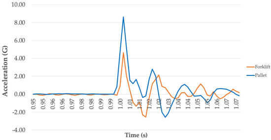 Comparisons made by pallet design show significant differences between the acceleration responses measured in the pallet and the forklift. However, there is no difference between the pallet designs, which show an increase of 10 G in the pallet when compared to the acceleration response measured in the forklift. The acceleration responses measured on the forklift and the pallet significantly change with different entry speeds. This acceleration difference ranges from 8 G–12 G.