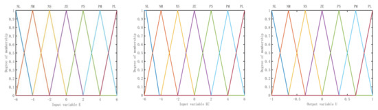 The E and EC of the main fuzzy controller are yaw rate error and error change rate, respectively. The input and output fuzzy subsets of the main fuzzy controller are: {NL, NM, NS, ZE, PS, PM, PL}. NL, NM, NS, ZE, PS, PM, and PL correspond to the linguistic forms of negative large, negative medium, negative small, zero, positive small, positive medium, and positive large. The membership function curve is shown in Figure 4, and the fuzzy control rules of the main fuzzy controller are shown in Table 2.