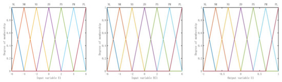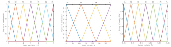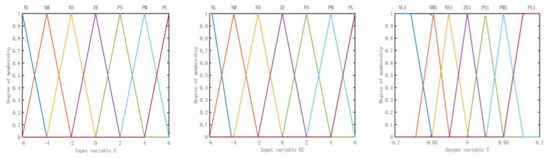 The input of the regulating fuzzy controller is the same as that of the main fuzzy controller. The output is the regulating coefficient T, and the fuzzy subset is [NL, NM, NS, ZE, PS, PM, PL]. NL, NM, NS, ZE, PS, PM, and PL1 correspond to the linguistic forms of negative large, negative medium, negative small, zero, positive small, positive medium, and positive large. The fuzzy rules are shown in Table 3. The membership function curve of the regulating fuzzy controller output is shown in Figure 5.