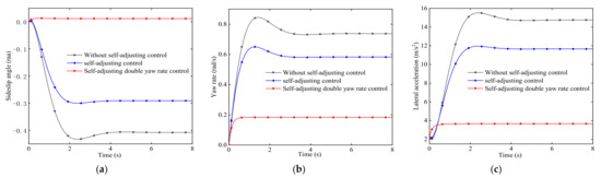 Simulation comparative analysis of self-adjusting double yaw rate feedback controller. (a) Sideslip angle. (b) Yaw rate. (c) Lateral acceleration.