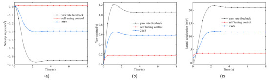 Figure 7a shows that the response speed of sideslip angle of the four-wheel steering vehicle with the yaw rate feedback controller is the same as that of the front-wheel steering vehicle, but the amplitude is large. However, the response speed of sideslip angle of the four-wheel steering vehicle under the self-tuning feedback control strategy is fast and the amplitude is small, the steady-state is 0, and the time to reach the steady-state is 0.1 s, which is greatly reduced compared with the yaw rate feedback and the 3 s under the steady-state condition of 2WS. It can be seen from Figure 7b that the yaw rate amplitude of the four-wheel steering vehicle with yaw rate control is large and the response speed is slow. After the self-tuning control is added, the response speed is further reduced, and the amplitude is smaller than that of the front wheel steering and yaw rate feedback control. It can be seen from Figure 7c that the lateral acceleration amplitude of the four-wheel steering vehicle with the self-adjusting double yaw rate control strategy is smaller and the response is faster.