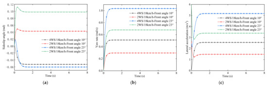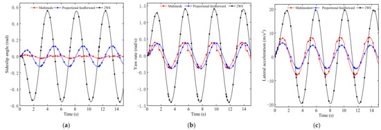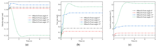 Simulation comparison of different rotation angles at medium speed. (a) Sideslip angle. (b) Yaw rate. (c) Lateral acceleration.