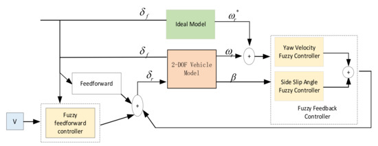 Shen et al. [14], based on sliding mode control theory, proposed a comprehensive control system combined with four-wheel steering and direct yaw moment control (DYC), which is effective. Cao et al. [15] took the front wheel angle and the vehicle speed as the input, used the fuzzy control theory, and established the fuzzy controller which decided the rear wheel angle. S Krishna et al. [16] designed a control system with the steering angle given by the driver, yaw rate error, and vehicle sideslip angle as input and calculated the additional steering angle as output. Gao et al. [17] designed a single neuron adaptive PSD and radial basis function and a neural network controller to form a composite control system, and the direct closed-loop training method is used to train in an offline way to improve the operation stability of four-wheel steering vehicles.