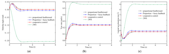 Figure 12 shows that compared with the front-wheel steering vehicle, the performance of the four-wheel steering vehicle is better in the sideslip angle, yaw rate, and lateral acceleration, and its handling stability is better. The amplitude of the sideslip angle of a four-wheel steering vehicle with a collaborative control strategy is lower than that of a four-wheel steering vehicle with proportional control and proportional plus fuzzy control, and it can reach 0 in steady-state, which combines the advantages of the two. Through a lot of simulation analysis and comparison, the cooperative control strategy can achieve the best control effect under the conditions of high speeds and a small angle.