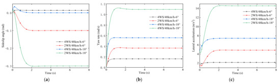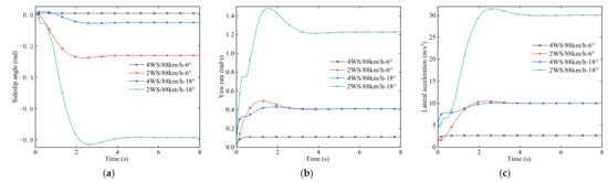 Simulation comparison of different rotation angles at high speed. (a) Sideslip angle. (b) Yaw rate. (c) Lateral acceleration.