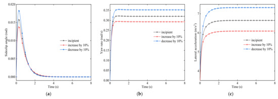 Simulation comparison of quality change. (a) Sideslip angle. (b) Yaw rate. (c) Lateral acceleration.