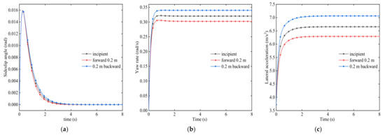 Simulation comparison of centroid change. (a) Sideslip angle. (b) Yaw rate. (c) Lateral acceleration.