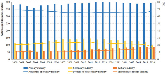 Water usage and proportion of various industries in China from 2000 to 2020.