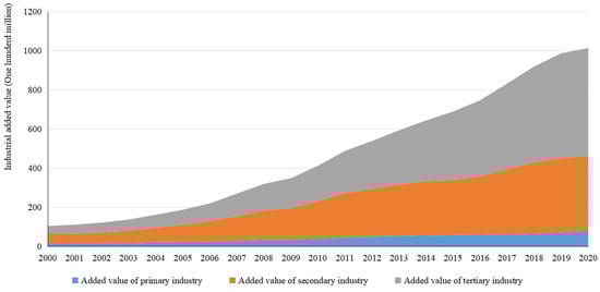 The added value in each industry of the past 20 years is shown in Figure 2. China’s economy maintains a high speed of development from 2000 to 2020, so the added value in each industry increases continually. The fastest growth occurs in tertiary industry, with an average annual growth rate of 0.07%, which demonstrates that China’s economy has gradually shifted into tertiary industry.