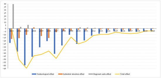 According to Equations (3)–(6), three effects and their respective contribution rates from 2000 to 2020 are shown in Figure 3. The total effect of each year is negative, indicating that the water intensity is decreasing year by year, signaling water saving considerations. The total effect from 2002 to 2003 was the smallest, with value of −64.50.