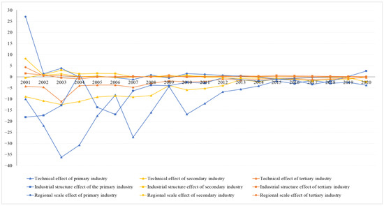 (1) from 2000 to 2020, the technological effect, industrial structure effect, and regional scale effect are −376.54, −89.85, and 20.66, respectively. The technical effect is from −59.91 to −4.05, and the industrial structure effect is from −17.11 to 1.62, indicating these two effects constrained the increase of water usage intensity. The regional scale effect was stable with values between −1 and 2. From the perspectives of different industries, each effect has the greatest impact on primary industry, followed by secondary industry, and finally tertiary industry.