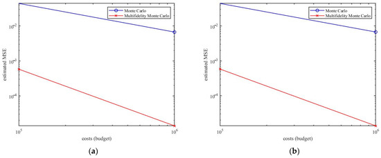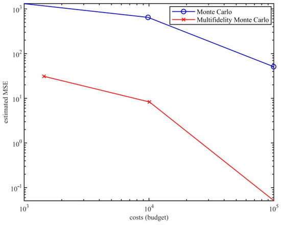 Figure 2 reports the estimated MSE (23) of the standard MC estimators and the MFMC estimators of budgets from to . Compared with the standard MC method, the MSE of our MFMC method is smaller. That is, the MFMC method can be significantly better than the standard MC. The multi-fidelity method based on data-driven low-fidelity model has the same convergence speed as the MC method. Under the same budget , MSE estimated by the MFMC method is about 30 times lower than the MC method. For the same convergence rate, this means that the speed of the MC estimation is increased by 30 times. In other words, the MSE estimation of MFMC is 0.1 when the calculation budget is 300, but the budget of MC is 9000 with the same value of MSE.