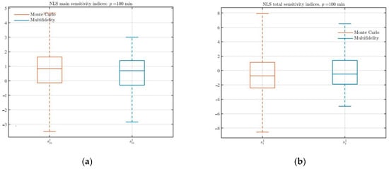In uncertainty quantification analysis, another concern is the sensitivity for initial value of random input to output variation. We use the Sobol index [35,36,37] to analyze the contribution of each input variable to the output variance. Figure 4 displays the main and total sensitivities box plots of the estimators repeated 100 times under different computational budgets. We note that the MFMC estimator can accurately predict the contribution of each input variable compared with the standard MC estimator. When the low-fidelity model is used, the sensitivity index of the estimator decreases, and the variance of the estimator is also reduced.
