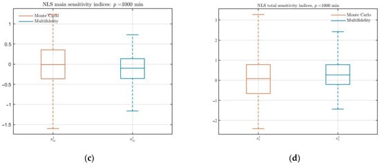 (a,b) Comparison of the MFMC and standard MC estimates of main or total effect sensitivities for the NLS Equation (18) with computational budgets . (c,d) Comparison of the MFMC and standard MC estimates of main or total effect sensitivities for the NLS Equation (21) with computational budgets .