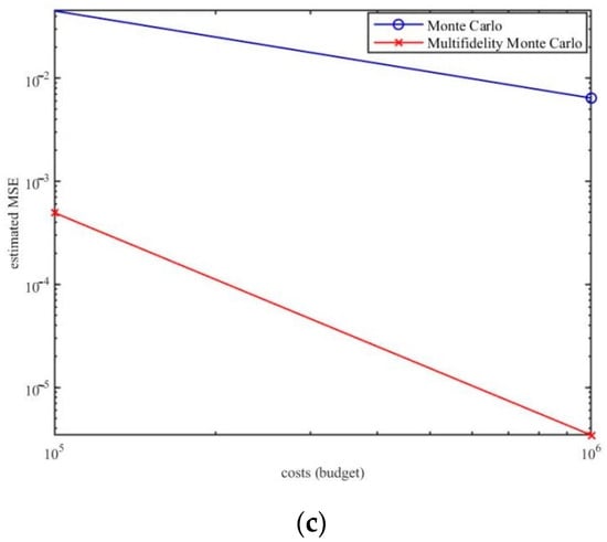 High-fidelity (FD) The high-fidelity model , low-fidelity models and are divided into three groups for comparative study. Figure 5 displays the estimated MSE (23) of those three models, respectively. The MSE of the MFMC estimator achieves a speedup of up to two orders of magnitude compared to the standard MC estimator. In the three numerical experiments, when the cost is , the MSEs estimated by the multi-fidelity models are , and in sequence. Therefore, the MSE of the models are further decreased when the calculation budget for output function expectation is increased.