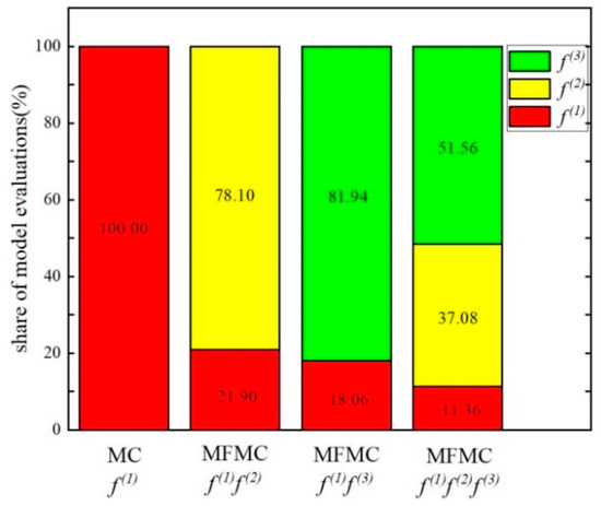 Compared with the standard MC method, under the same computational budget, the MFMC can be superior to the MC for each statistical quantity. Figure 6 shows the relative share of each model in the total number of samples. The shares of the models vary by orders of magnitude between the high-fidelity and low-fidelity models, reflecting their correlations and costs. It should be noted that the relative share of the model is not related to the calculation budget , because all components of are linearly proportional to .