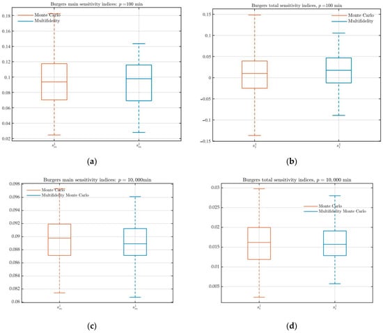 To further analyze the parameter uncertainty law of Burgers’ equation, the sensitivity of the parameter is studied. Figure 7 reports the standard MC and MFMC estimator, respectively, in and computational budget, repeated times estimates of the main sensitivity and total sensitivity box plots. It is worth noting that compared with the standard MC estimation, the sensitivity index of the MFMC method estimator decreases and the estimated variance is also reduced. Therefore, in all cases, compared with the standard MC estimation, the multi-fidelity estimation has smaller variance with the budget increases. When the true value of the sensitivity index is closer to zero, the variance of the estimator is similar as the order of sensitivity magnitudes.