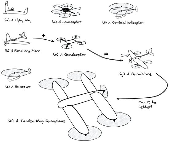 - A quadplane [,,]—combines the benefits of a VTOL quadcopter with all features of a fixed-wing plane. The drawbacks include higher take-off mass and increased drag due to extra motors and motor holders or additional motor tilting mechanics. The wings and the tailplane make this type of drone less agile in hover and more prone to wind gusts.